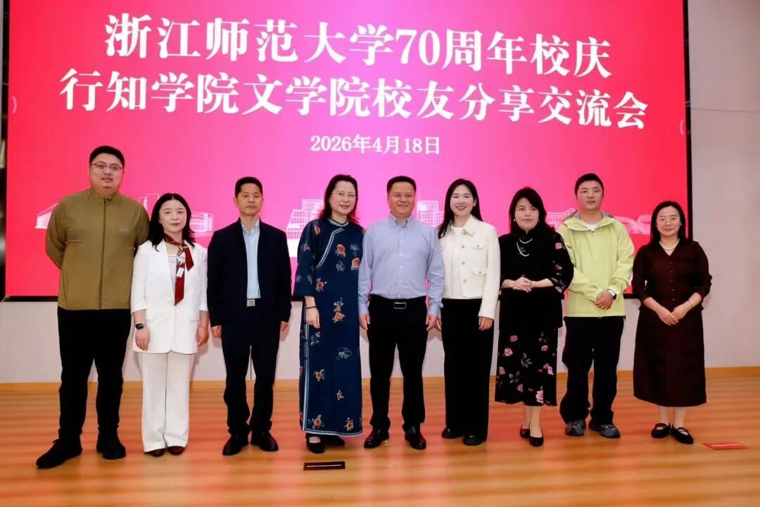 2026年4月18日14时,浙江师范大学70周年校庆行知学院文学院校友分享交流会在1号教学楼报告厅圆满举行。本次座谈会特邀优秀校友吴雪岚、黄遐、吴明明、郑冰洁、陈展返校交流。出席活动的领导有行知学院党委书记刘星喜、党委副书记陈建伟、副院长蒋芬君,文学院院长俞敏华、党总支书记孙启夏,文学院全体辅导员及部分学生共同参与。